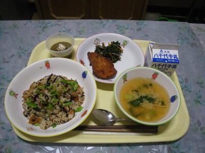 ひじきごはん 牛乳 白身魚の竜田揚げ 磯あえ かきたま汁 抹茶プリン