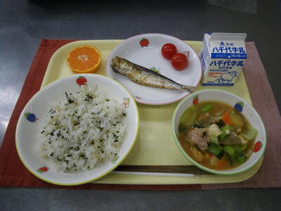 わかめご飯 牛乳 さばの塩焼き(3年生は、いわしの塩焼き) ミニトマト さつま汁 花みかん