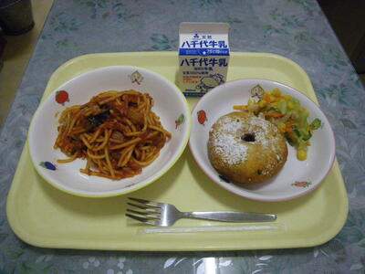 なすとツナのトマトスパゲティ 牛乳 りっちゃんのサラダ かぼちゃドーナッツ