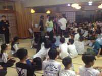 夜は、キャンプファイヤーを予定しておりましたが、雨のため、室内レクとしました。キャンプファイヤー担当が、火の神を招いてからレクがスタートしました。「マイムマイム」を踊ったり、ゲームをしたりとても盛り上がりました。