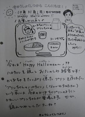 10月31日の給食(ハロウィーンお楽しみこん立て) 投稿日時 : 2022/10/31 新井小学校管理者 キャロットライス 牛乳 ハッシュドポーク コーンサラダ かぼちゃプリンのプリンちゃん 今日はHappy Halloween!!かぼちゃのプリンを給食室で作りました。「プリンちゃんのハロウィン」という本に出てくるかわいいキャラクター「プリンちゃん」をイメージしたかぼちゃプリンです。でも低学年には「かぼちゃ=野菜」という抵抗感が強かったようです。高学年ではよく食べてくれていました。 Tweet {{options.likeCount}} {{options.likeCount}} {{options.unlikeCount}} {{options.unlikeCount}} 0 コメント