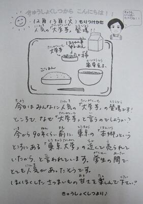 12月13日の給食 投稿日時 : 2022/12/13 新井小学校管理者 ご飯 牛乳 家常豆腐 ほうれん草中華和え 柿 ほうれん草の中華和えが人気でした。よく食べていました。ごま油としょうゆの風味は子どもたちに人気があるようです。 Tweet {{options.likeCount}} {{options.likeCount}} {{options.unlikeCount}} {{options.unlikeCount}} 0 コメント