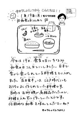1月19日の給食(和食の日献立) 投稿日時 : 01/19 新井小学校管理者 茶飯 牛乳 大豆のかき揚げ 五目きんぴら 一口おでん りんご 今日は19日なので「食育の日」日本で昔から食べられている「きんぴら」を出しました。きんぴらは、江戸時代から人々に親しまれ、作って食べていた料理です。昔は砂糖が高価だったので、砂糖を入れずに作っていたそうです。 Tweet {{options.likeCount}} {{options.likeCount}} {{options.unlikeCount}} {{options.unlikeCount}} 0 コメント