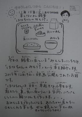 11月15日の給食 投稿日時 : 2022/11/16 新井小学校管理者 五穀ごはん 牛乳 豚肉のしょうが焼き おかか和え みそ汁 一口りんごゼリー 「本となかよし給食」として、2015年に映画化もされた「はなちゃんのみそ汁」という本を紹介しました。 温かいみそ汁を味わって、子どもたちが本にも興味を持ってくれるといいですね。 Tweet {{options.likeCount}} {{options.likeCount}} {{options.unlikeCount}} {{options.unlikeCount}} 0 コメント