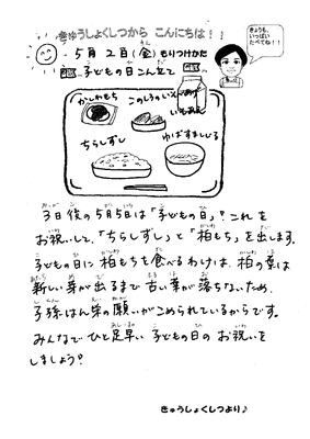 5月2日の給食(子どもの日こん立て) 投稿日時 : 05/02 新井小学校管理者 ちらし寿司 牛乳 このしろの磯辺揚げ 磯和え 湯葉すまし汁 柏もち 昨日は歩き遠足で給食がありませんでしたので、2日ぶりの給食です。5月5日の「こどもの日」をお祝いして、ちらし寿司と柏もちを出しました! Tweet {{options.likeCount}} {{options.likeCount}} {{options.unlikeCount}} {{options.unlikeCount}} 0 コメント
