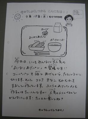 4月18日の給食 投稿日時 : 2022/04/18 新井小学校管理者 よくばり揚げパン 牛乳 ポークビーンズ オレンジ いつも人気のよくばり揚げパン、今日もほぼ完食でした! Tweet {{options.likeCount}} {{options.likeCount}} {{options.unlikeCount}} {{options.unlikeCount}} 0 コメント