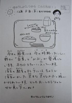 12月8日の給食 投稿日時 : 2022/12/08 新井小学校管理者 チキンライス 牛乳 しゃりしゃりガーリック大豆 白菜とかぶのホワイトシチュー りんご ちょうど1年生が「大きなかぶ」の学習をしていたので、かぶのホワイトシチューを作りました。 野菜たっぷりでしたが、よく食べていました。 Tweet {{options.likeCount}} {{options.likeCount}} {{options.unlikeCount}} {{options.unlikeCount}} 0 コメント