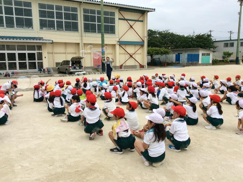 7月14日(水)、1年生とあゆみ学級1組合同で、しゃぼん玉体験をしました。