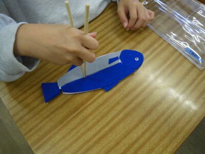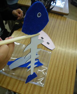 フェルトで手作りした教材を使って、お魚の身のはずしかた、上手な食べ方を栄養教諭から教わりました。