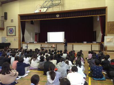「続きは、学校図書館の本を読んでください」とどんぐりさん。本好きな子が増えそうな楽しい読み聞かせの会でした。