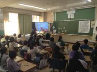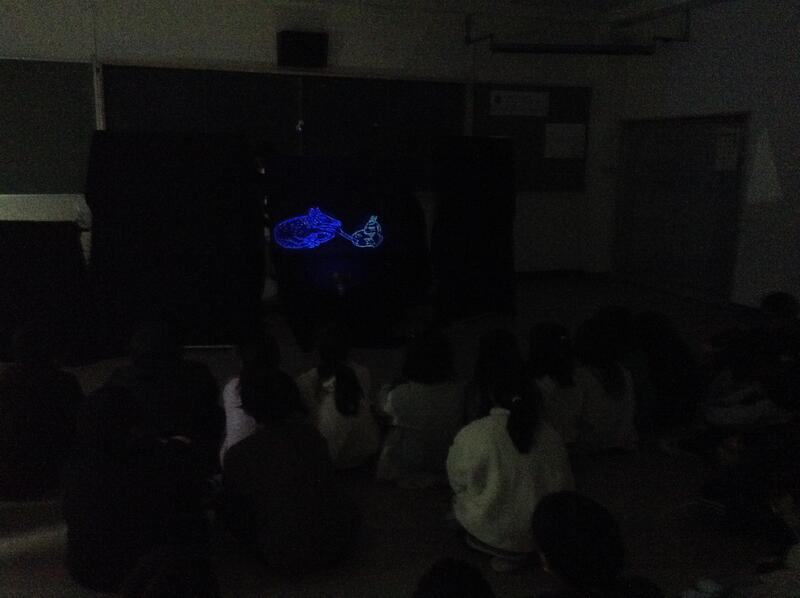 視聴覚室を遮光カーテンで真っ暗にして、まるで映画館のような雰囲気に子供たちもわくわくした様子。