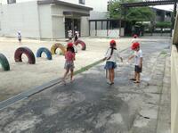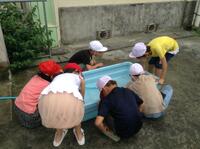 それぞれの容器に水を入れ、校庭に向かって水をかけたり