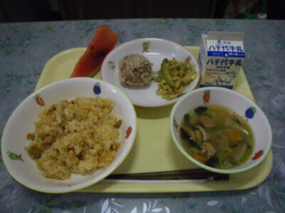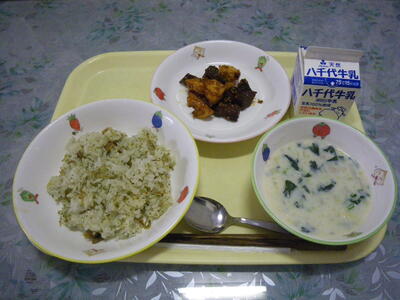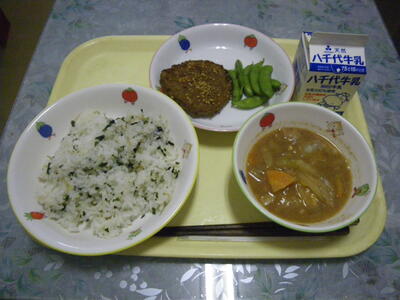 わかめご飯 牛乳 いわしのさんが焼き 具だくさんみそ汁 松永さんの枝豆