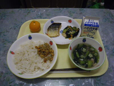 麦ごはん 牛乳 大豆とじゃこのふりかけ さばの塩焼き きゅうりとわかめのあえもの 七夕汁 冷凍みかん