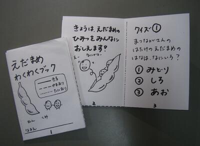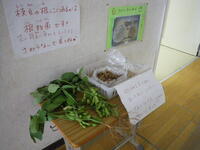今日は、3年生とあゆみ学級のみなさんが、市川市原木で農業をしている「松永さん」の枝豆のさや取りをお手伝いしてくれました。事前学習として、「えだまめわくわくブック」やインターネットの資料を使い、枝豆には花が咲くこと、マメ科の植物の特徴として、根に「根粒菌(こんりゅうきん)」があることなどを学びました。