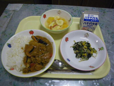 夏野菜カレーライス 牛乳 ほうれん草とコーンのソテー フルーツパンチ