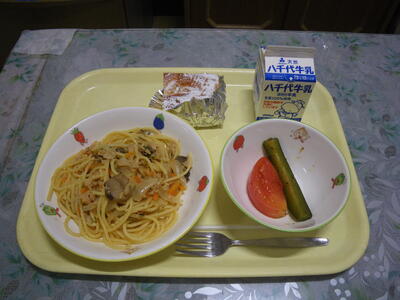 ツナスパゲティ 牛乳 トマトときゅうりのマリネ 市川梨のケーキ