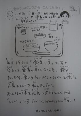 「黙食」なので、いつも給食時には子どもたちと手話で会話をしていますが、今日は「全部おいしいよ!」と手話で伝えてくれた子どもが何人もいました。とてもうれしかったです。レバーは、一度下茹でをしてから生姜醤油につけてくさみを抜き、米粉をまぶして油で揚げています。揚げるとレバー独特のくさみが消えて、おいしく食べられます!