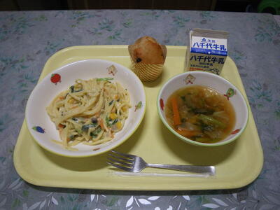 きのこのクリームスパゲティ 牛乳 野菜スープ はらぺこあおむしのカップケーキ
