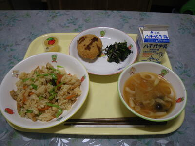 油揚げご飯 牛乳 さつまいもコロッケ 磯和え みそ汁 りんごのひとくちゼリー