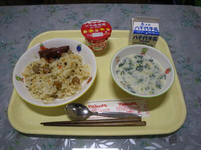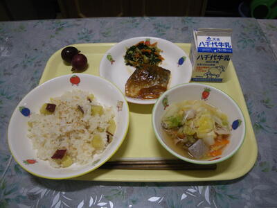 さつまいもご飯 牛乳 さばのみそ煮 ごま和え 白菜の具だくさん汁 ぶどう