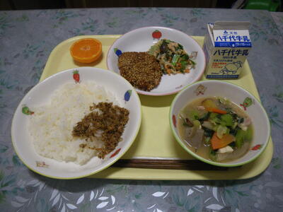 ご飯 牛乳 いわしのかば焼き 納豆あえ 豚肉とごぼうの炊き合わせ 花みかん