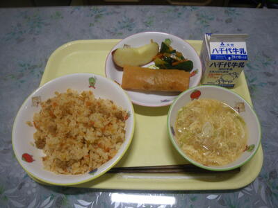キムチご飯 牛乳 ピリ辛春巻き きゅうりのナムル風 卵スープ りんご