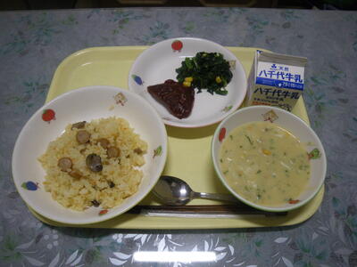 五穀ごはん 牛乳 さつまいもの天ぷら ほうれん草のお浸し 豚肉とごぼうの炊き合わせ