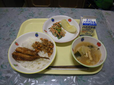 そぼろご飯 牛乳 大豆のかき揚げ 豆腐のすまし汁 牛乳プリン