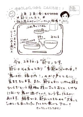 今日は節分なので、鬼を追い払ってくれる「いわし」と「大豆」を献立に取り入れました。
