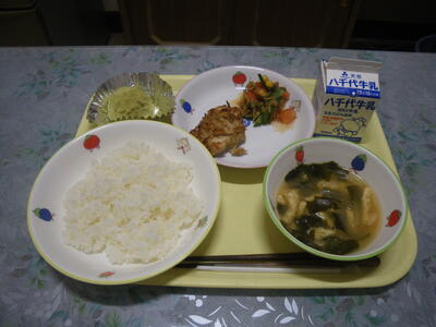 ご飯 牛乳 鶏肉のごまネーズ焼き トマトと青じそのサラダ 油揚げと玉ねぎのみそ汁 うぐいすもち