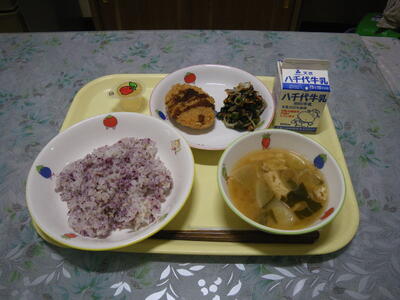 ごはん 牛乳 いわしのかばやき 大豆とじゃこのふりかけ 小松菜のツナあえ みそ汁 りんご