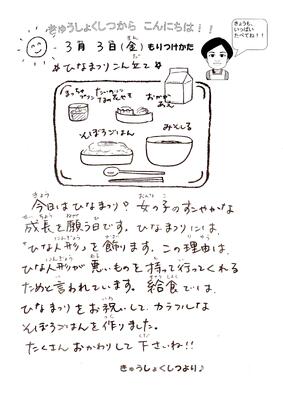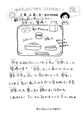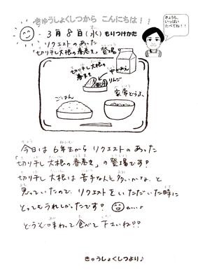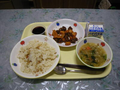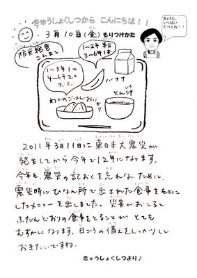 今日の給食は、12年前の3月11日に発生した、東日本大震災の記憶を忘れないために、「防災給食」として、当時避難所で出された食事を参考にしたメニューにしました。