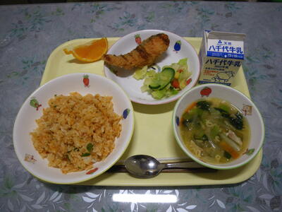 ジャンバラヤ 牛乳 さけフライ イタリアンサラダ ABCスープ オレンジ(デコポン)