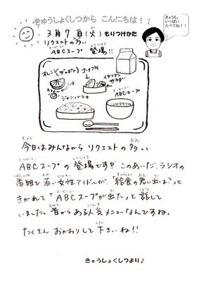 人気のABCスープ、お代わりしている子がたくさんいました。味つけは普通のコンソメスープなのですが、ABCのマカロニが入るだけで、子どもたちにとっては楽しく、うれしいようです。みんな「何が入っているかな?」と探しながら、楽しそうに食べていました。