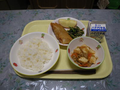 ごはん 牛乳 切り干し大根の春巻き ほうれん草中華あえ 家常豆腐 りんご