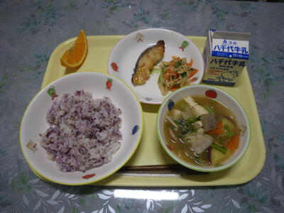ゆかりごはん 牛乳 白身魚の西京焼き 小松菜のマヨネーズあえ さつま汁 オレンジ(清見オレンジ)