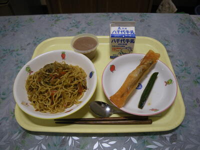 焼きそば 牛乳 ししゃものパリパリ揚げ 中華きゅうり チョコレートプリン