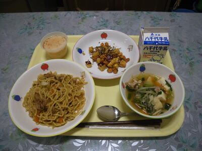 焼きそば 牛乳 大豆とさつまいものあげがらめ 中華スープ 牛乳プリン