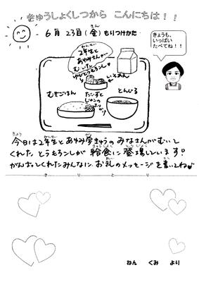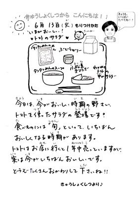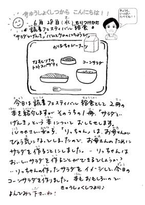 今日も読書フェスティバル給食です。おたよりでは「サラダでげんき」という本を紹介しましたが、給食時間の放送では図書委員の人が「バムとケロのにちようび」という本を読んで紹介してくれました。