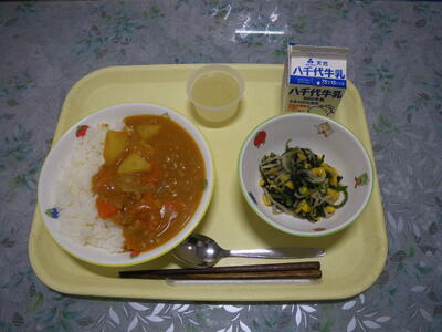ご飯 牛乳 米粉のキーマカレー ほうれん草とコーンのソテー 市川梨のゼリー