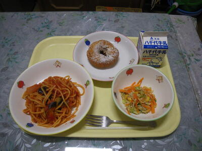 なすとツナのトマトスパゲティ 牛乳 コーンサラダ かぼちゃドーナッツ