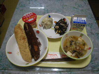 よくばり揚げパン 牛乳 大豆しゅうまい ひじきのマリネ はるさめスープ ヨーグルト