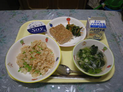 鮭ごはんは、先日5年生が「お米博士になろう」の学習でおにぎり作りをしていたのですが、おにぎりの具に「鮭」を選んでいる人が多かったので、給食に取り入れました。みんなよく食べていました。