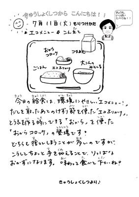 だしを取ったあとの削り節で作ったエコふりかけと、豆腐をつくるときにできる搾りかすの「おから」を使ったおからコロッケを出しました。どちらも捨てられてしまうことが多い食材ですが、このように少し手を加えることでりっぱなおかずになります。環境にもやさしいエコメニューです。コロッケが大人気でした。