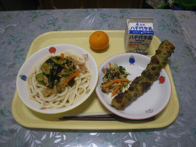 冷やしうどん 牛乳 ちくわの磯辺揚げ 小松菜のマヨネーズ和え 冷凍みかん