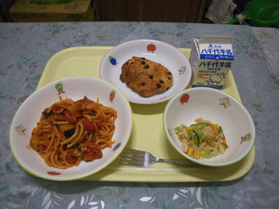 なすとツナのトマトスパゲティ 牛乳 コーンサラダ チョコチップスコーン