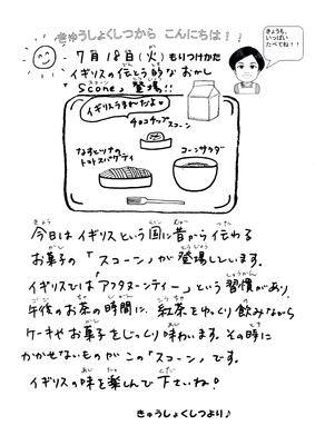 イギリスの伝統的なお菓子「スコーン」を給食室で手作りしました。中に入れたチョコチップは、熱で溶けにくいタイプのチョコレートを使っています。よく食べていました。