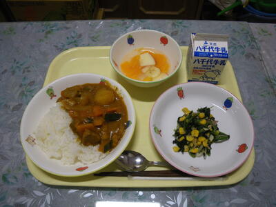 夏野菜カレーライス 牛乳 ほうれん草とコーンのソテー フルーツパンチ