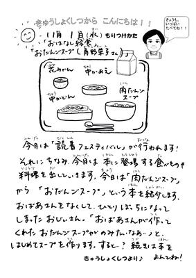 今月は読書フェスティバルにちなみ、「おはなし給食」として、本に出てくる料理や食べ物を給食で紹介していきます。今日は角野栄子さんの「おだんごスープ」を紹介しました。
